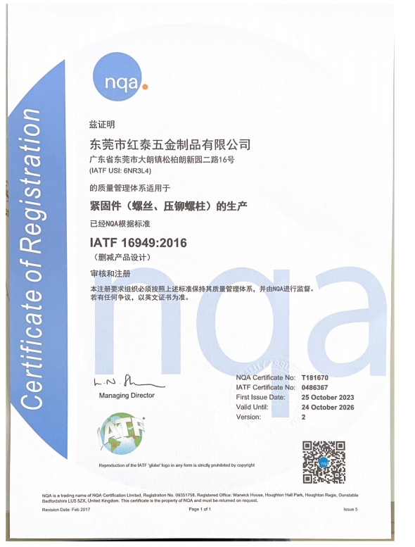 東莞市紅泰五金制品有限公司,公司占地六千多平方米,擁有五十多組螺絲機及六十臺自動車床設備。是一家專業(yè)設計、生產(chǎn)ISO、DIN、GB、JIS、ANSI、BS及客戶指定特殊要求的高精密五金緊固件的制造企業(yè)。